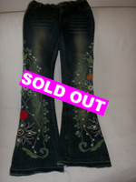 | ブルーデニムの上からグリーンを落としたような少し珍しい色です。前後脇に入った刺繍がとても可愛く、しまつもとても綺麗です。裾は切りっぱなし仕様です。 |