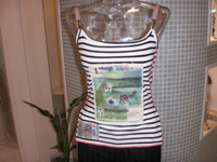 肩ひもの部分がサスペンダーのようになっています。ストレッチの効いた柔らかい素材に大きなプリントのパッチワークが付いたとてもおしゃれなデザイン。両サイドのスリットと端の赤のステッチがまたか わいいです。 |