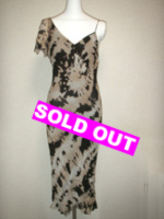 | ピンクベージュにコーヒー色を混ぜたような色使いのワンピースです。肩をアシメトリーにしていて、スリップタイプとフレアースリーブの組み合わせ。控えめなマーメイドラインで女らしさUP! |