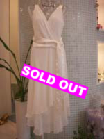 | シフォン風のワンピース。きれいな白で水玉の地模様がはいっています。肩とウエストのサテンリボンもアクセント。サイドファスナー付きで装着もしやすくおしゃれで可愛い一品です。 |